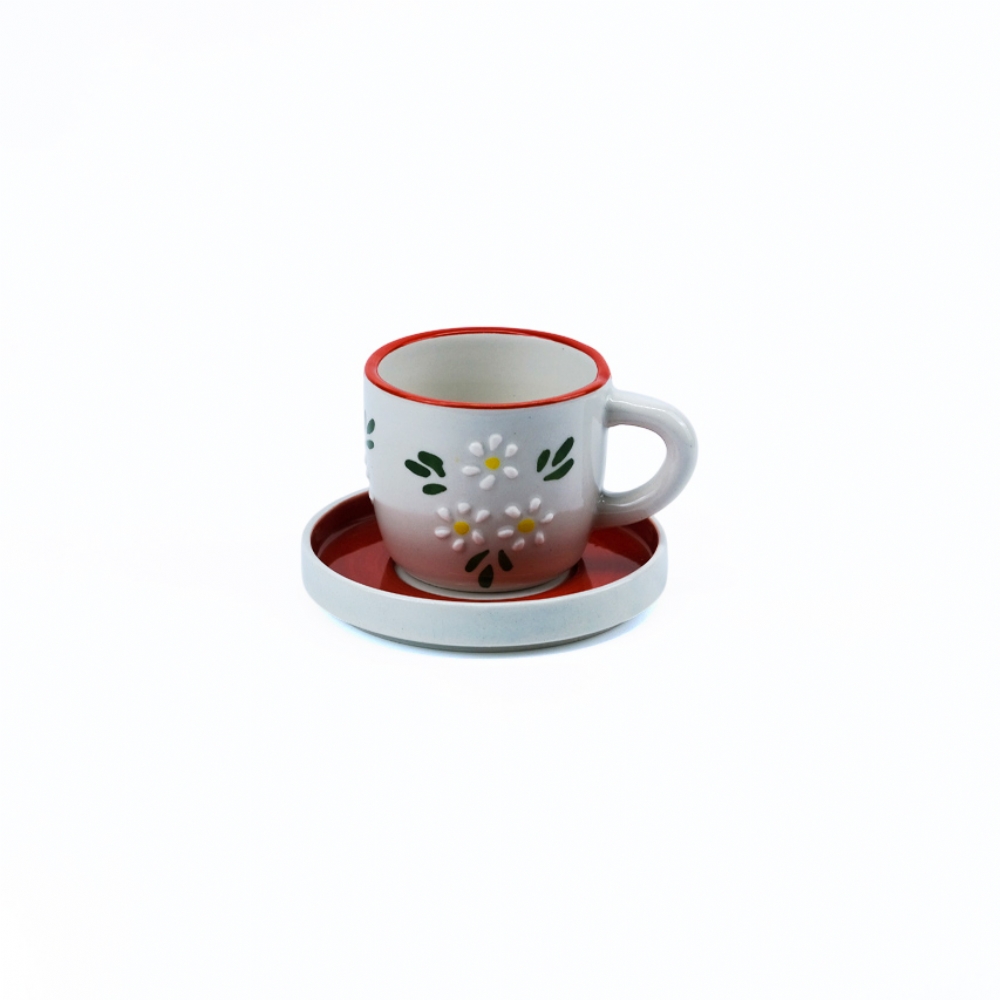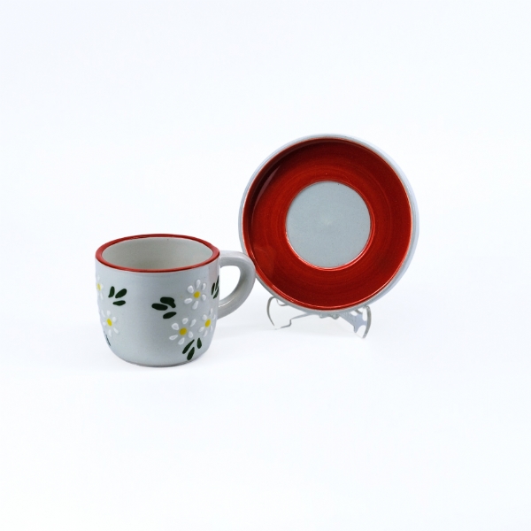 Sadelik ve zarafeti bir arada sunan papatya desenli seramik fincan, çay ve kahve keyiflerinizi daha özel hale getirir. Beyaz papatyaların naif dokunuşları, yeşil yapraklarla bütünleşirken kırmızı bordür detayı ise tasarıma canlı bir karakter katar. Hem günlük kullanım için hem de misafir sofralarında şık bir sunum yapmak için ideal bir seçimdir.