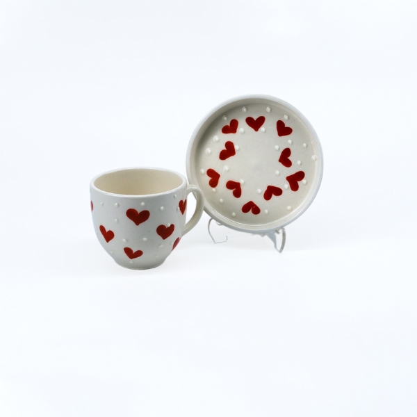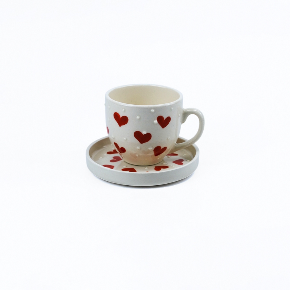 Aşkın ve zarafetin buluştuğu bu kalp desenli seramik fincan, günlük içecek keyfinize romantik bir dokunuş katıyor. Beyaz seramik zemin üzerine özenle yerleştirilmiş kırmızı kalp motifleri ve kabartmalı beyaz noktalar, hem sevimli hem de şık bir görünüm sunar. El işçiliğini andıran detaylarıyla öne çıkan bu set, çay veya kahve molalarınızı daha özel hale getirir.
