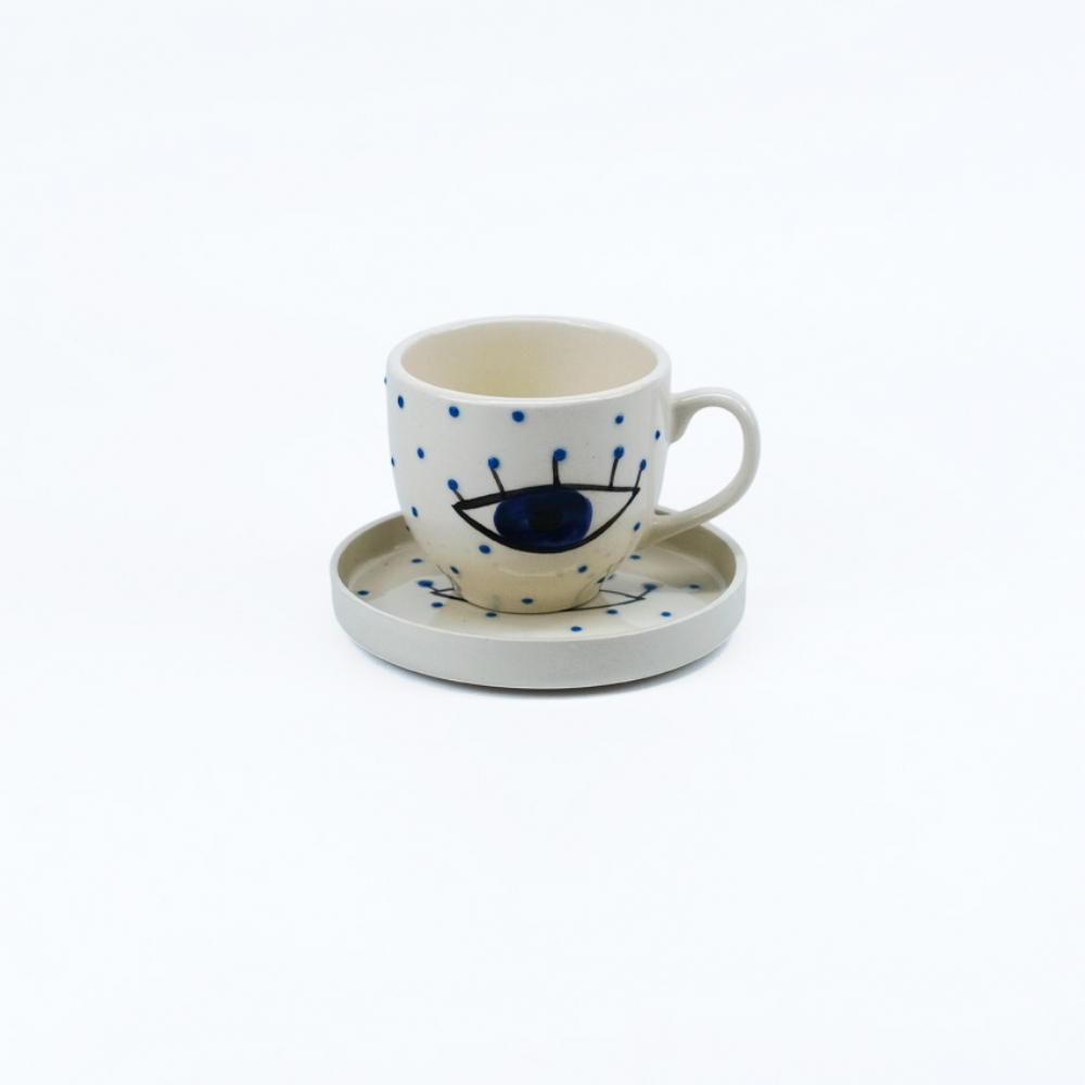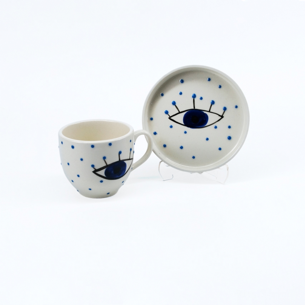 Bu özel seramik kahve fincanı ve tabağı, gelenekseli modernlikle buluşturur. Krem zemin üzerindeki stilize mavi göz (nazar boncuğu) figürü, hemen dikkat çeker ve tasarıma anlam katar. Parlak sır kaplaması, fincana dayanıklılık ve estetik bir görünüm kazandırır.