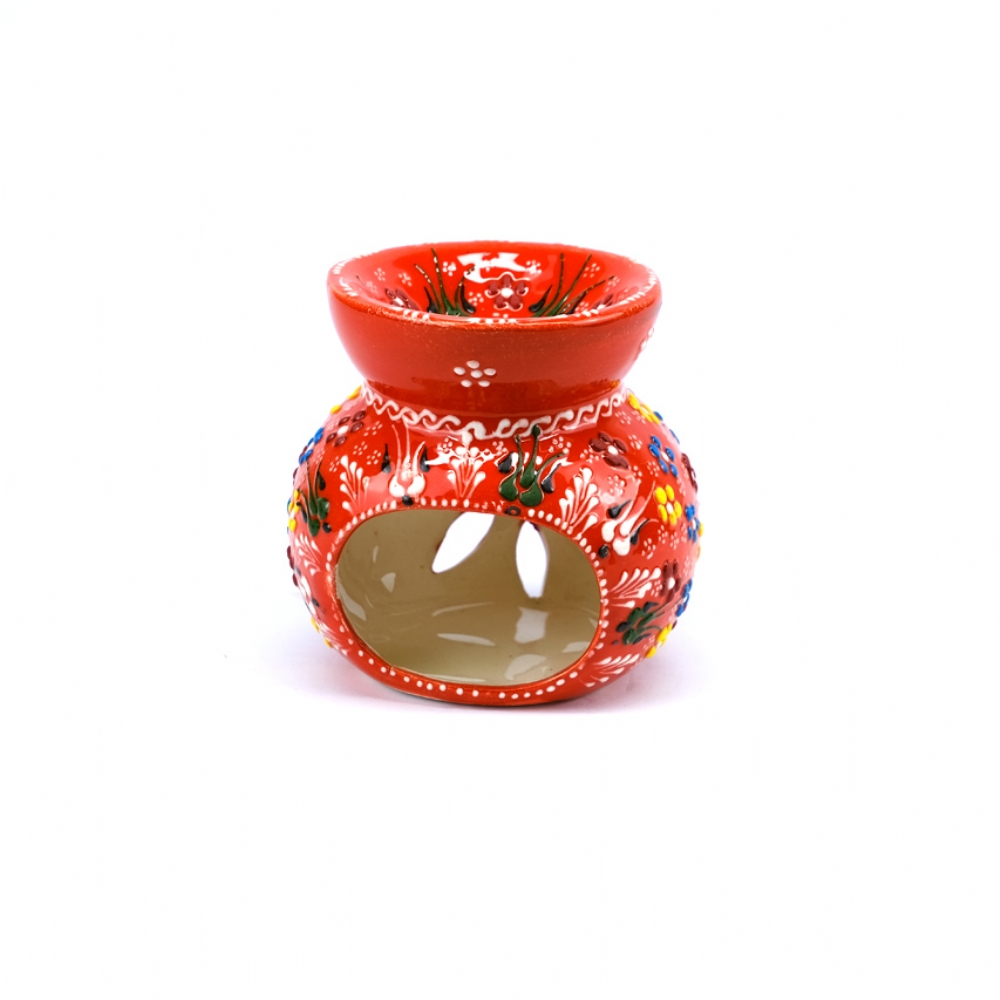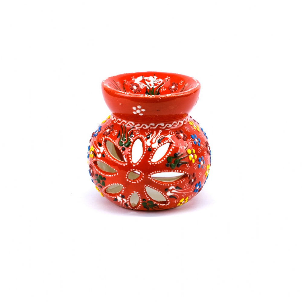 Bu enerjik seramik buhurdanlık, bulunduğu ortama sıcaklık ve neşe katar. Parlak mercan kırmızısı zemin üzerindeki mavi, sarı ve beyaz çiçek motifleri, geleneksel çini sanatının coşkulu renklerini modern bir yorumla sergiler. Gövdesindeki dekoratif oyuklar, içine konulan mum ışığının etrafa sanatsal desenler halinde yansımasını sağlar.