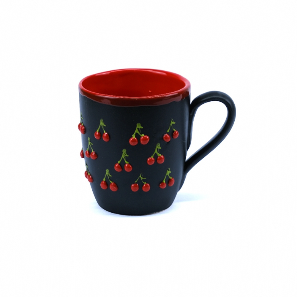 Bu Mat Siyah Kiraz Kupa, sofistike matlığı ve canlı kırmızı detaylarıyla iddialı bir tasarıma sahiptir. Kupayı tamamen saran kadifemsi mat siyah seramik yüzey, üzerine işlenmiş kabartma ve parlak kırmızı kiraz motiflerini güçlü bir şekilde öne çıkarır. Kupada modern bir kontrast oluşturan detaylar ise, fincanın iç kısmı ve ağız kenarındaki kalın şeridin parlak kırmızı renkte olmasıdır. Bu tasarım, şık ve dikkat çekici bir estetik sunar.
